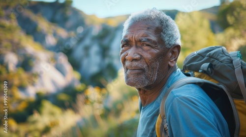 © Vlad, Obraz premium Outdoor Sports. Black Senior Male Suffering Shoulder Pain and Back Injury After Hiking Accident