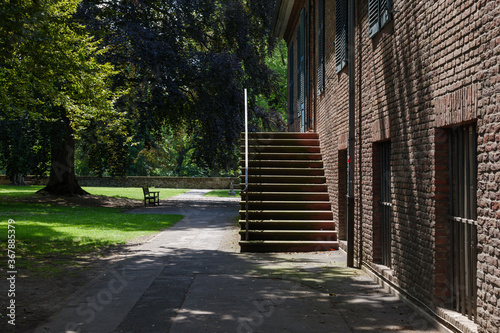 Obraz premium Outdoor sunny and shady scenery around old rough historical brick facade and staircase of Stadtmuseum Düsseldorf and Rosengarten, tranquil garden.