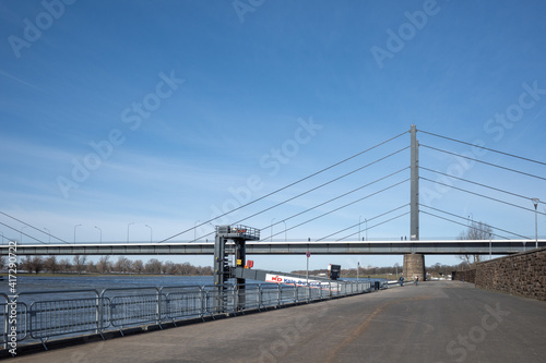 © Peeradontax, Obraz premium Outdoor sunny view along promenade riverside and bridge toward pier, pontoon or buoy over Rhine River and background of suspension bridge in Düsseldorf, Germany.