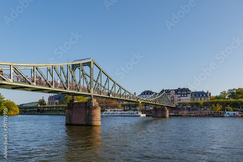 © Peeradontax, Fototapeta premium Outdoor sunny view of Eiserner Steg, historical pedestrian Iron Bridge, and promenade on riverside of Main River in sunny day in Frankfurt, Germany.