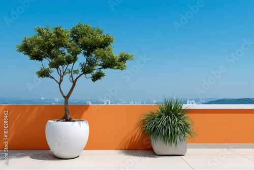 © kardaska, Obraz premium Outdoor terrace with potted trees and city view