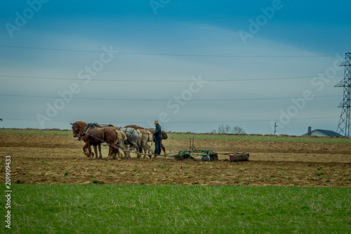© Fotos 593, Obraz premium Outdoor view of amish farmer using many horses hitch antique plow in the field
