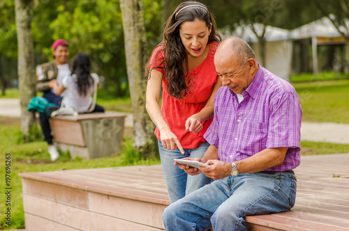 © Fotos 593, Fototapeta premium Outdoor view of father and daughter using a cellphone in the park