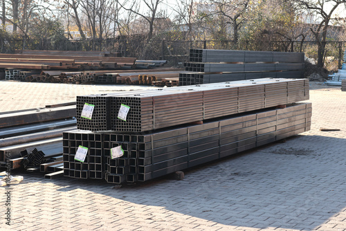 Naklejka premium Outdoor view of stacked square and rectangular steel hollow section profiles...