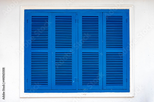 Fototapeta premium Outdoor vintage blue colour window with white cement, Wooden louver window...