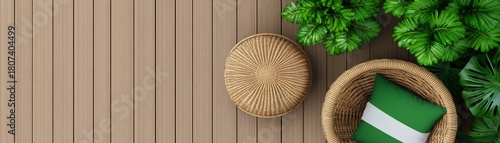 © Photo18@desing, Obraz premium Outdoor wicker furniture, plants, wood deck, top view, relax ,terrace