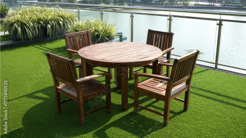 Obraz premium Outdoor Wooden Patio Set on Green Artificial Turf with Lake View and Natural Lighting