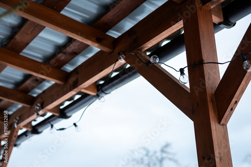© True Pixel Art, Obraz premium Outdoor wooden terrace structure with a corrugated metal roof, featuring string lights with round bulbs and a pale sky with tree branches in the background.