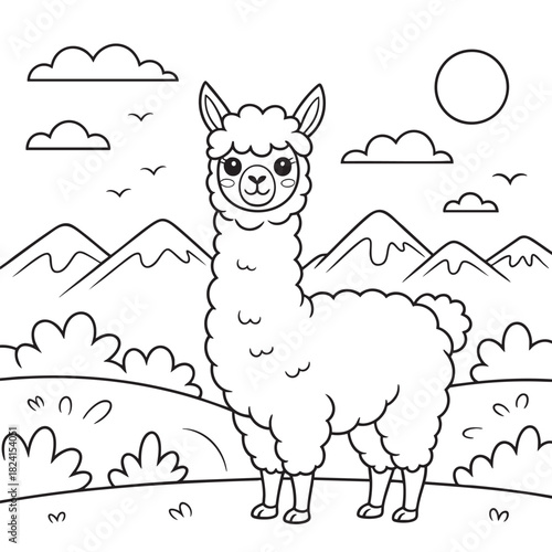 Naklejka premium Outline drawing of a llama in a landscape with mountains and clouds Keywords: llama, alpaca, animal, mammal, livestock, pet, cute, fluffy, woolly, farm, agriculture, nature, outdoors, field, grass