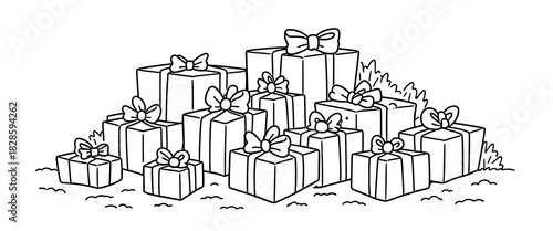 Obraz premium Outline drawing of a stack of gift boxes with bows, holiday celebration,...