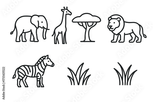 Obraz premium Outline drawings of savanna animals and plants: elephant, giraffe, lion, zebra, tree, grass