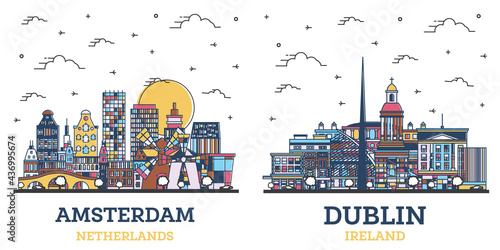 Fototapeta premium Outline Dublin Ireland and Amsterdam Netherlands City Skyline Set.