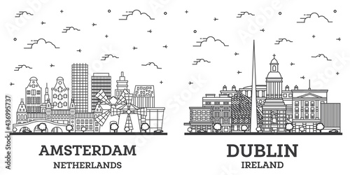 Obraz premium Outline Dublin Ireland and Amsterdam Netherlands City Skyline Set.