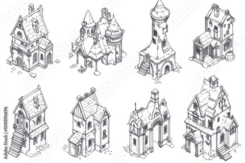 © 2D Illustration, Fototapeta premium Outline fantasy buildings, simple isometric symbols pack for Wonderdraft, black and white line art, plain white background