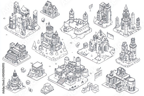© 2D Illustration, Fototapeta premium Outline fantasy buildings, simple isometric symbols pack for Wonderdraft, black and white line art, plain white background