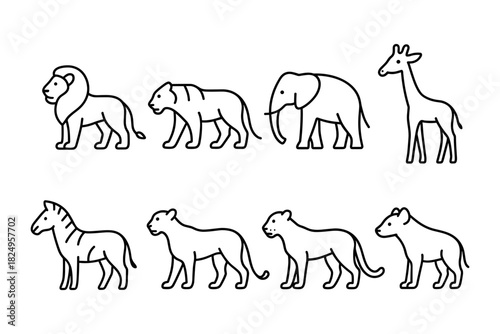 Naklejka premium Outline icons of wild African animals. Includes lion, tiger, elephant, giraffe, zebra, cheetah, leopard, and hyena in walking poses. Perfect for safari, zoo, or wildlife themes. Vector illustration.