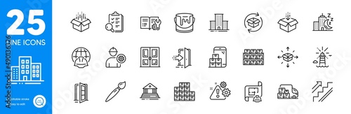 © blankstock, Fototapeta premium Outline icons set. Delivery truck, Warning and Engineer icons. Door, Boxes shelf, Entrance web elements. Inspect, Engineering documentation, Global engineering signs. Lighthouse. Vector