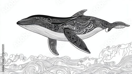 © sanntoru, Naklejka premium Outline illustration of a black and white whale for drawing and coloring on white background