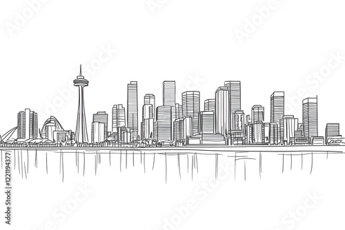 Fototapeta premium Outline illustration of a city skyline featuring skyscrapers and iconic...
