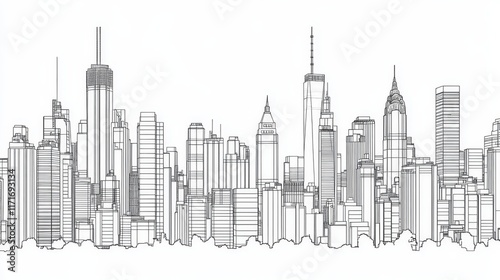 Fototapeta premium Outline illustration of a city skyline featuring various tall buildings and...