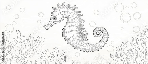 Fototapeta premium Outline illustration of a seahorse resting underwater surrounded by bubbles