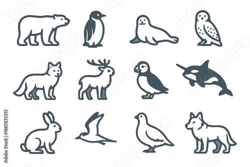 Fototapeta premium Outline illustrations of various animals including bear, penguin, seal, and wolf