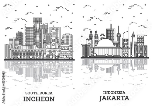 Naklejka premium Outline Jakarta Indonesia and Incheon South Korea City Skyline Set.