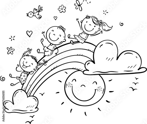 Fototapeta premium Outline little kids sitting on rainbow. Line art happy children, vector illustration
