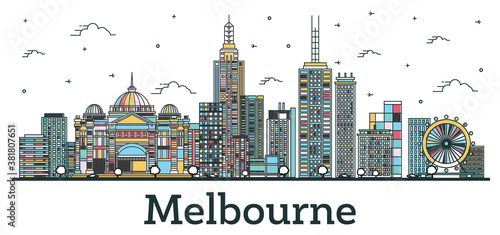 Obraz premium Outline Melbourne Australia City Skyline with Color Buildings Isolated on White.