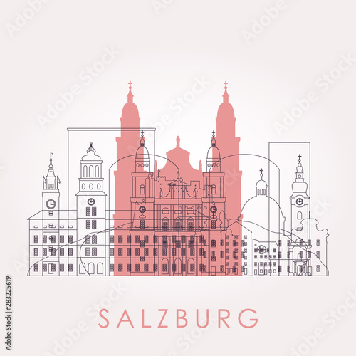Obraz premium Outline Salzburg skyline with landmarks. Vector illustration. Business travel and tourism concept with historic buildings. Image for presentation, banner, placard and web site.