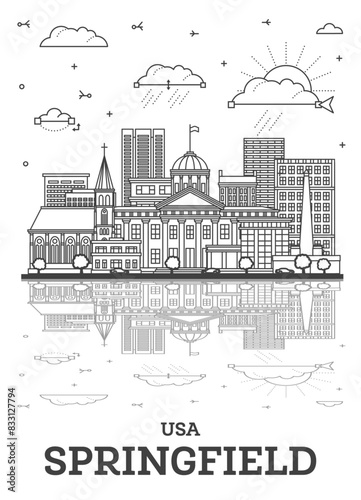 Fototapeta premium Outline Springfield Illinois City Skyline with Modern Buildings and Reflections Isolated on White. Springfield USA Cityscape with Landmarks.