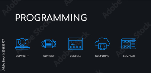 © t-vector-icons, Fototapeta premium 5 outline stroke blue compiler, computing, console, content, copyright icons from programming collection on black background. line editable linear thin icons.