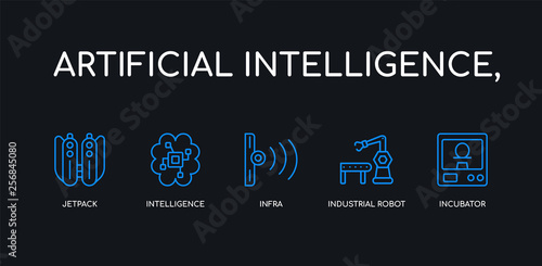 Obraz premium 5 outline stroke blue incubator, industrial robot, infra, intelligence, jetpack icons from artificial intelligence, collection on black background. line editable linear thin icons.