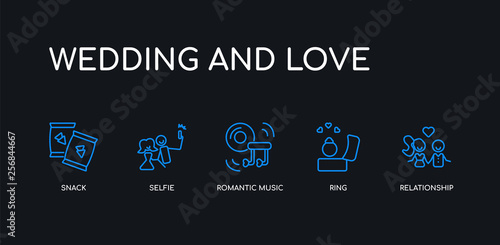 Fototapeta premium 5 outline stroke blue relationship, ring, romantic music, selfie, snack icons from wedding and love collection on black background. line editable linear thin icons.
