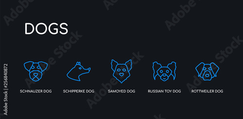© t-vector-icons, Naklejka premium 5 outline stroke blue rottweiler dog, russian toy dog, samoyed dog, schipperke schnauzer icons from dogs collection on black background. line editable linear thin icons.