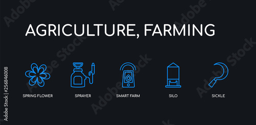 © t-vector-icons, Naklejka premium 5 outline stroke blue sickle, silo, smart farm, sprayer, spring flower icons from agriculture, farming collection on black background. line editable linear thin icons.