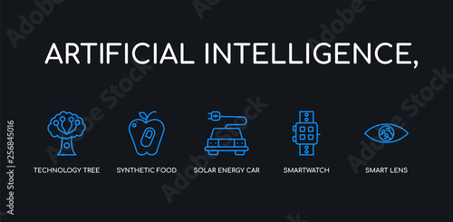 © t-vector-icons, Naklejka premium 5 outline stroke blue smart lens, smartwatch, solar energy car, synthetic food, technology tree icons from artificial intelligence, collection on black background. line editable linear thin icons.