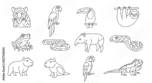 © Tutorialxxx18, Naklejka premium Outlined illustrations of various jungle animals, showcasing diverse species in a simple line art style.