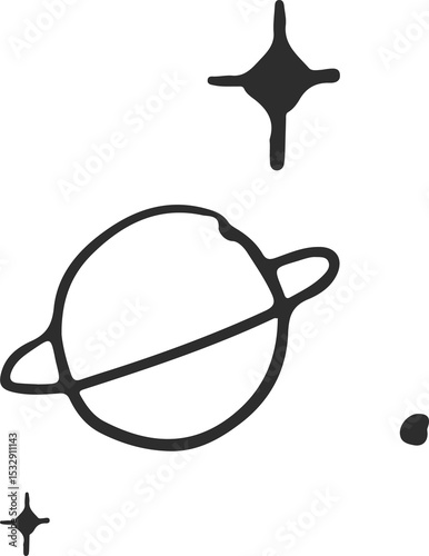 © vectorfusionart, Naklejka premium Outlined ringed planet floating among glowing stylized stars and dot, transparent background