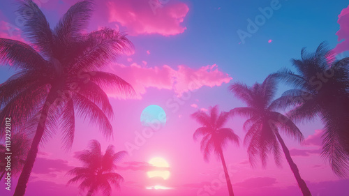 © Pavithiran, Naklejka premium Outrun Synthwave style - 1990s retro aesthetic with palm trees and tropical sunset in pink and blue