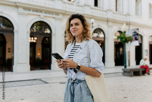 Fototapeta premium Outside portrait of pretty woman with wavy hair wearing striped t-shirt and blue shirt with eco bag walking on the street in sunny warm day and using smartphone