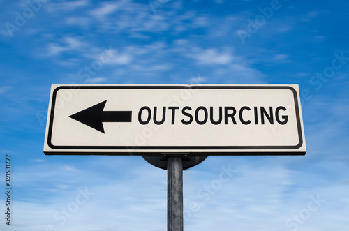 Fototapeta premium Outsourcing work force. White sign with arrow with offshore. Direction sign....