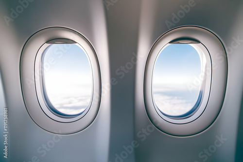 © Jawed Gfx, Fototapeta premium Oval airplane windows with metallic frames, against a light blue background