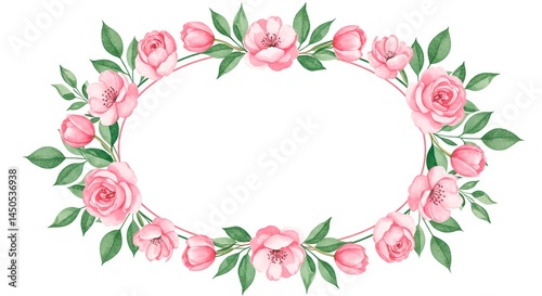 Fototapeta premium Oval floral frame with pink roses tulips and green leaves on a white background watercolor illustration