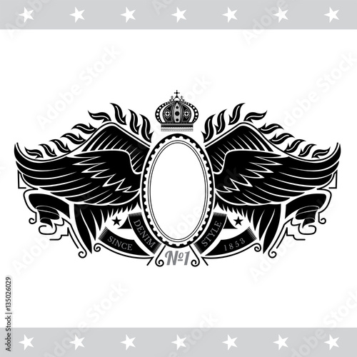 © Bohdan Petrushko, Naklejka premium Oval frame with ribbon between two pair wings with fair. Heraldic vintage label on white