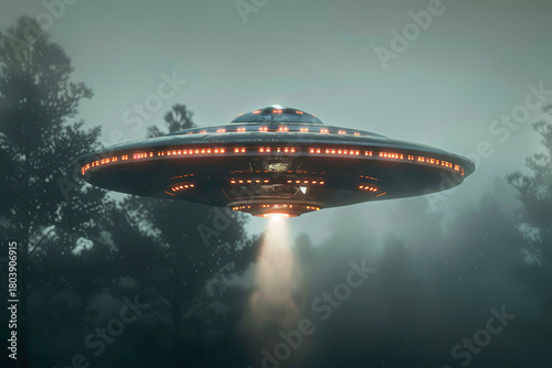 © Olegarx525, Fototapeta premium Oval UFO saucer hovering over beautiful landscape in deep dramatic sky