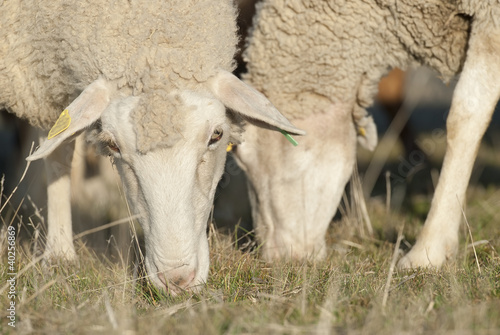 © Angel Simon, Obraz premium Ovejas comiendo hierba.