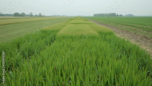 © RABBI, Obraz premium Overcast Day, Lush Green Field with Mowed Patches, Dirt Road and Barren Fields Background