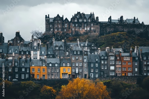 © Supawi, Naklejka premium Overcast day view of densely clustered historic houses on hillside