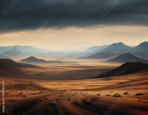 Naklejka premium overcast plain with scattered few distant hills in the horizon emptiness desolate terrain overcast